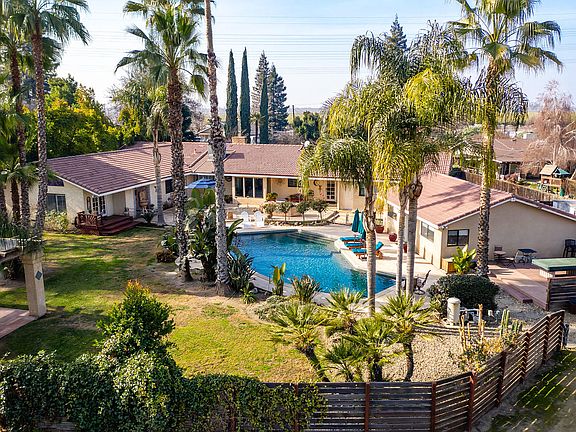 This stunning custom home sits on a meticulously manicured 1.6 acre lot featuring a 1,800 SF shop w/ car lift & rear property access, covered RV parking w/ dump station, 240' crystal clear well w/ 3HP pump, tennis court, and a 750 SF pool house with full bathroom, utilities, and separate septic - perfect for a mother-in-law conversion! The main home is approx. 3,589 SF with 5 bedrooms, 3 bathrooms, 2 A/C units, 2 car garage with additional carport and a 6th bedroom/office with private entrance! A beautiful chef's kitchen awaits, complete with high end appliances, double oven, appliance cabinet and walkthrough pantry opens right into the family room with gorgeous wood-look porcelain tile flooring and lovely shutters on new windows throughout! The Master Suite has a large walk-in shower, heated/jetted tub, and private patio. The backyard is an entertainer's dream with its sparkling pebble-tech pool, built-in BBQ island, covered seating areas, and a spectacular view of the Sierras!