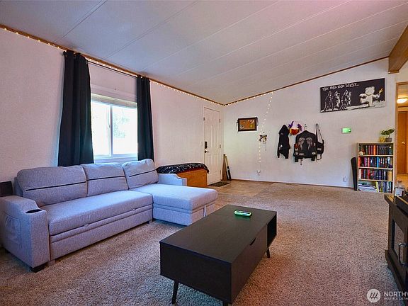 Tucked away at the end of a quiet dead-end road, this charming home is move-in ready! Just under 1,200 sq. ft., it offers 2 spacious bedrooms and 2 bathrooms with an open and inviting layout. The large family room flows seamlessly into the open kitchen and cozy dining nook, with sliding doors that lead out to a deck overlooking the backyard—perfect for entertaining or relaxing around the fire pit. Practical perks include a laundry room, outbuilding for extra storage, and a long driveway with plenty of parking. Towering evergreens provide shade and privacy, creating a peaceful retreat. New Roof 2019), plus washer, dryer, dishwasher, and refrigerator all replaced within the last 4 years. Conveniently located near JBLM and I-5.
