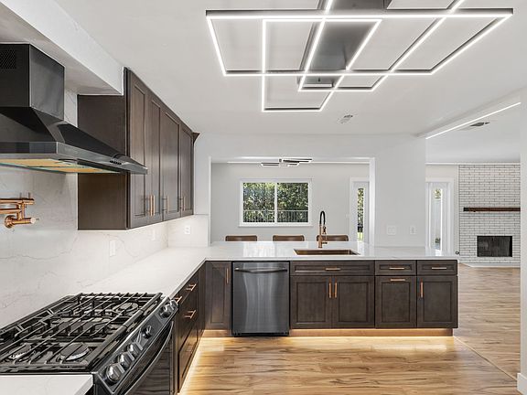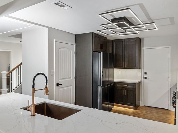 Walking into the kitchen you will enjoy the copper accents on the modern cabinets contrasted to the quartz countertops. Dark stainless steel appliances make the space warm and inviting. It even has a dedicated pantry.