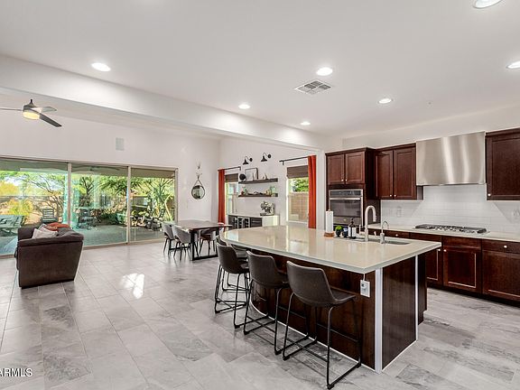 Meticulously maintained 4-bedroom, 3-bath home with 3-car garage and RV gate on a premium corner lot! Built in 2015, this spacious home offers a versatile floor plan on a desirable corner lot with no rear neighbors for added privacy. Inside, stylish tile flooring flows throughout the open-concept layout, enhanced by multi-panel sliding doors that create seamless indoor/outdoor living. The chef's kitchen features a gas cooktop, stainless steel appliances, an oversized island with seating for six, and a walk-in pantry. The main level includes the owner's suite and two additional bedrooms with a full bath, while the owner's suite boasts a luxurious bath with a separate soaking tub and shower, dual sinks, and a custom walk-in closet. Upstairs provides a private guest retreat or office space, complete with the fourth bedroom, a full bath, and a large loft. Step outside to your desert-style backyard oasis with low-maintenance landscaping, an oversized spa, and a custom fire pit perfect for relaxing or entertaining friends and family.