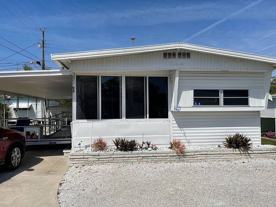 This is a mobile home in a 55+ community on a rented/leased lot. This home is great for year round or seasonal living! The 2020 A/C keeps it all cool! It is a 2BR/1BA mobile home with vinyl, laminate and carpet throughout and comes mostly furnished/turnkey. The open kitchen has 12" vinyl flooring, wooden cabinets for storage, an electric stove and a refrigerator. The living/dining area has laminate and carpet and panel walls. Both bedrooms have carpet and a closet. The bathroom has a single sink vanity and a walk in shower. There is a carport that can park two cars, tandem style with a shed on the back. The shed has power and washer/dryer (included in the sale) hook ups. There is a private back yard for grilling! The lot rent is $431 and includes water, sewer, trash and a clubhouse. Plaza Mobile Park is a 55+ community located 9 miles from Bradenton Beach and central to Downtown Bradenton amenities and services.