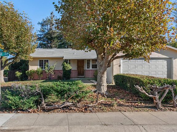 Situated on a corner lot with thoughtful updates and a prime location. Front lawn enhanced by automatic sprinklers, mature shade trees, and a brick façade. Step through the formal entry into a light-filled interior featuring hardwood flooring, dual pane windows, and central forced air heating and cooling throughout. The spacious living room centers around a cozy tile-surround wood-burning fireplace, with a screened-in patio just off the living area, perfect for additional entertaining or relaxation space. The kitchen boasts a delightful breakfast nook and the adjacent dining area is bathed in natural light, creating an ideal setting for meals and gatherings. The primary bedroom suite includes a private ensuite bathroom with a stall shower and tile flooring. Two additional bedrooms offer mirrored double-door closets and share a full bath complete with a vanity, tile floors, and a shower over tub. Enjoy outdoor living in the tranquil, low-maintenance backyard, featuring a sprawling paver patio, and a lower-level covered patio with a storage shed. A two-car attached garage provides abundant storage and convenience. Prime location near top amenities: Just minutes from Concord Community Park, BART station, and major highways. Close to schools, shopping centers, restaurants, and more!