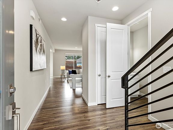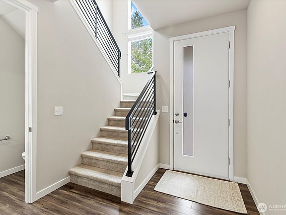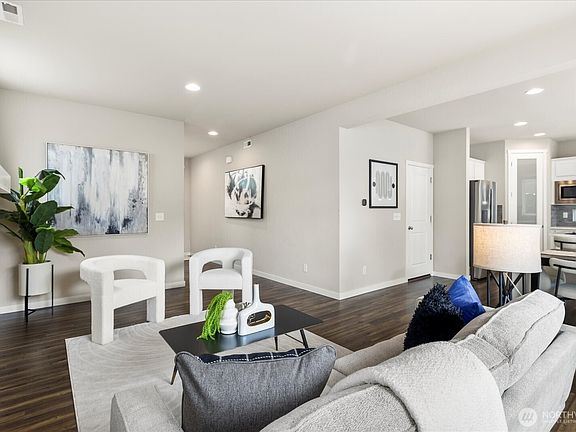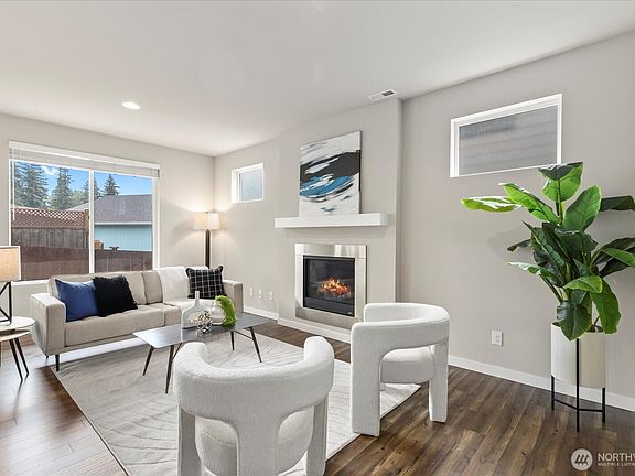 The "Gibson" built by Sea Pac Homes was designed with thoughtfulness and precision. Like new, this home has everything someone could want for entertaining or just relaxing after a long day. Your entire main floor has Evoke "Doris" flooring. The dream kitchen has gorgeous cabinetry, quartz counters with designer backsplash, center island, stainless steel appliances, and walk-in pantry with plain frosted glass door. Spacious Great room offers a gas fireplace and a natural flow to the dining room and kitchen. Upstairs provides a large 2nd living space, laundry room, and 2 spacious bedrooms plus an oversized primary suite with a 5-piece bath and walk-in closet. 2-car garage, additional off-street parking, and 3 community visitor parking spots.