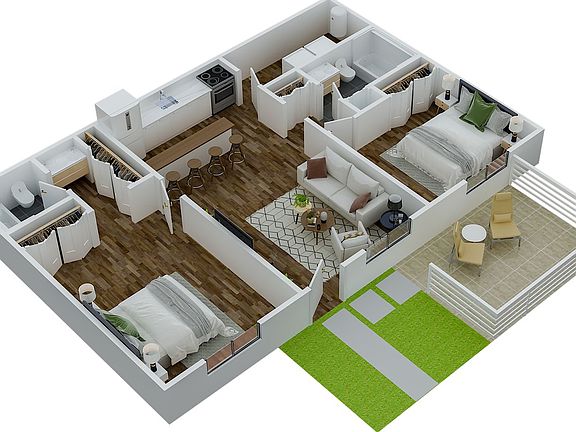 This expansive two-bedroom, two-bath floor plan combines functionality with cottage charm. Enter through your private entry and discover a modern kitchen with full-size appliances, an inviting living area with vinyl flooring throughout, and a bonus room with washer/dryer hookups offering extra versatility. Each bedroom features generous closet space, while two full bathrooms each with a tub/shower combo provide convenience and privacy. Step outside to your private fenced-in patio, a perfect sanctuary for relaxing or entertaining under the open sky.