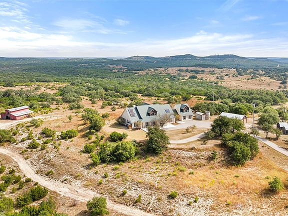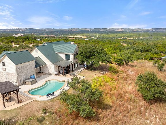 Million Dollar Views!!! Welcome to this remarkable unrestricted 10.1-acre hilltop estate, offering panoramic vistas that stretch for miles. Experience breathtaking sunsets from this serene Hill Country retreat. The property is bordered by a sprawling 2,000+ acre ranch, providing exceptional privacy along the rear fence line. The estate features a total of 4,213 +/- square feet, including a main residence (3353 SF) and guest quarters (860 SF) , 6 BDRM and 3 Baths, accommodating family and guests with comfort and style. 2023 the property was extensively remodeled w/designer finishes and numerous upgrades, including a spa-like primary suite w/luxurious bath, walk-in closet and laundry area. Large picture windows throughout the home capture stunning Hill Country views from every angle. The dining room is “picture perfect” surrounded by glass and towering ceiling. The great room is highlighted by a massive stone wood-burning fireplace creating a warm and inviting atmosphere. The kitchen is truly a chef’s dream, outfitted w/stainless steel appliances, six-burner range w/exhaust vent, built-in ice maker, microwave, dishwasher, double ovens, and farmhouse sink, a spacious butler pantry with wine chiller, providing ideal storage for entertaining and convenience. Enjoy the outdoors with a swimming pool, hot tub, and incredible views from the covered porches and spacious deck, perfect for relaxing or hosting gatherings. Exterior amenities include a 7KW solar panel system, 40,000-gallon rainwater collection system, 4,000-gallon concrete storage tank for water well. Covered parking area, paved circular driveway, livestock barn, chicken coop, metal covered parking area, metal pole barn, raised bed garden area and seasonal pond and fencing. This is a property you will be proud to call home.