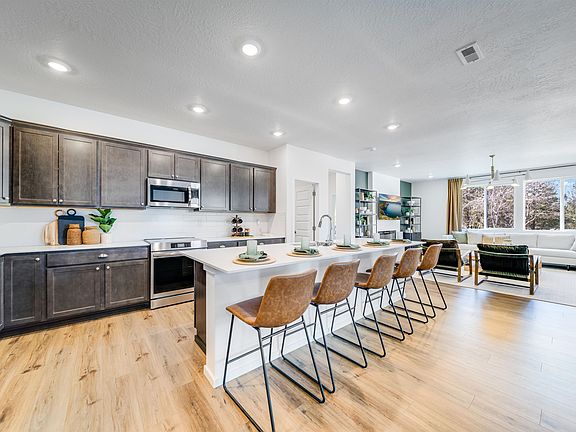 Nestled in the heart of Spokane Valley, this stunning two-story home blends modern design with a vibrant community lifestyle. The first level features a spacious open floorplan where the Great Room, kitchen, and dining area seamlessly connect, plus a versatile den off the entry and a convenient secondary bedroom. Sliding glass doors lead to a covered patio—perfect for enjoying Spokane Valley’s beautiful outdoors. Upstairs, four additional bedrooms, including the expansive owner’s suite with a spa-like bath, surround a generous bonus room, offering plenty of space for relaxation and gathering. Prices, dimensions and features may vary and are subject to change. Photos are for illustrative purposes only.