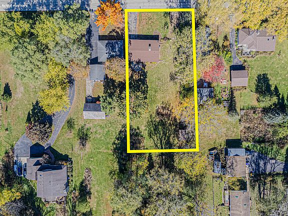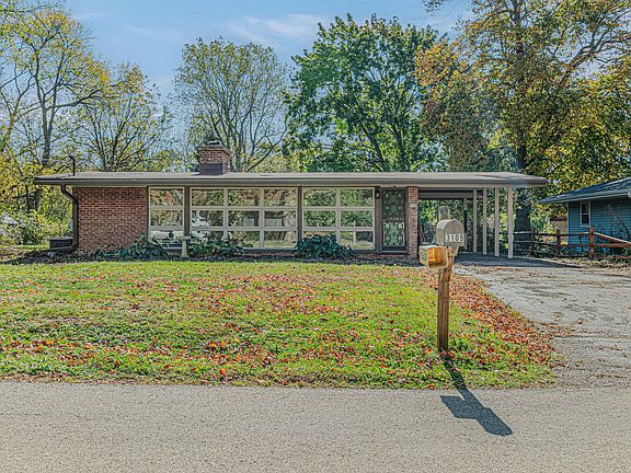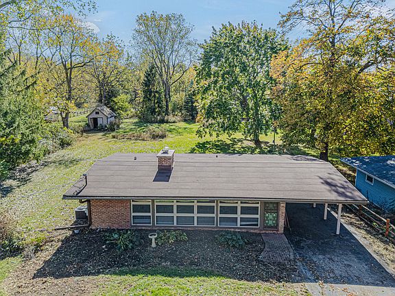This stylish, architecturally interesting all-brick home sits on an oversized 1.55 ACRES parcel. Enter through the front door into a living room featuring a wall of floor-to-ceiling windows, a 9ft pitched ceiling, wood beams, directional lighting, upgraded window treatments, and fireplace with brick surround. Additional eating area adjoining the living room. Beautiful hardwood floors throughout the living and bedroom spaces. The kitchen features stone countertops, good condition cabinets, and large vinyl windows with view of the backyard. Sizable bedrooms. Full unfinished basement with finished bathroom. Carport parking. Large shed. Selling AS IS!