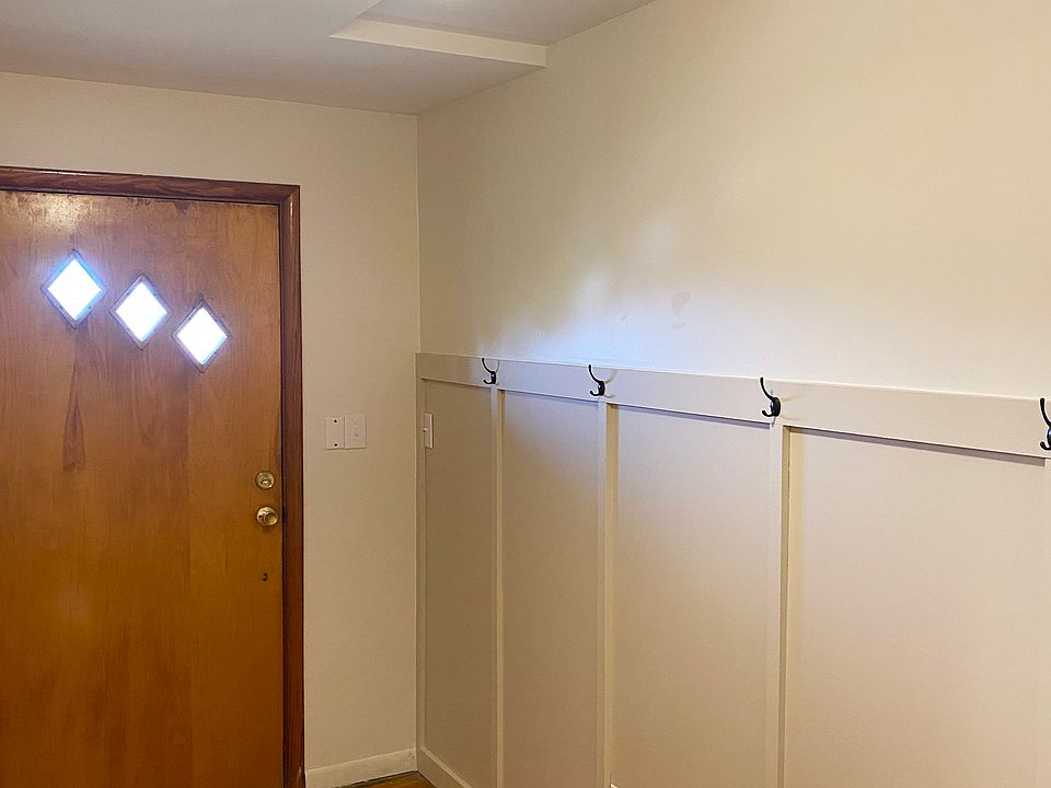The unit offers one bedroom, one bathroom, and a living room, along with an in-unit washer and dryer for added convenience. The newly updated foyer features board and batten detailing with hooks for easy storage of coats and accessories.