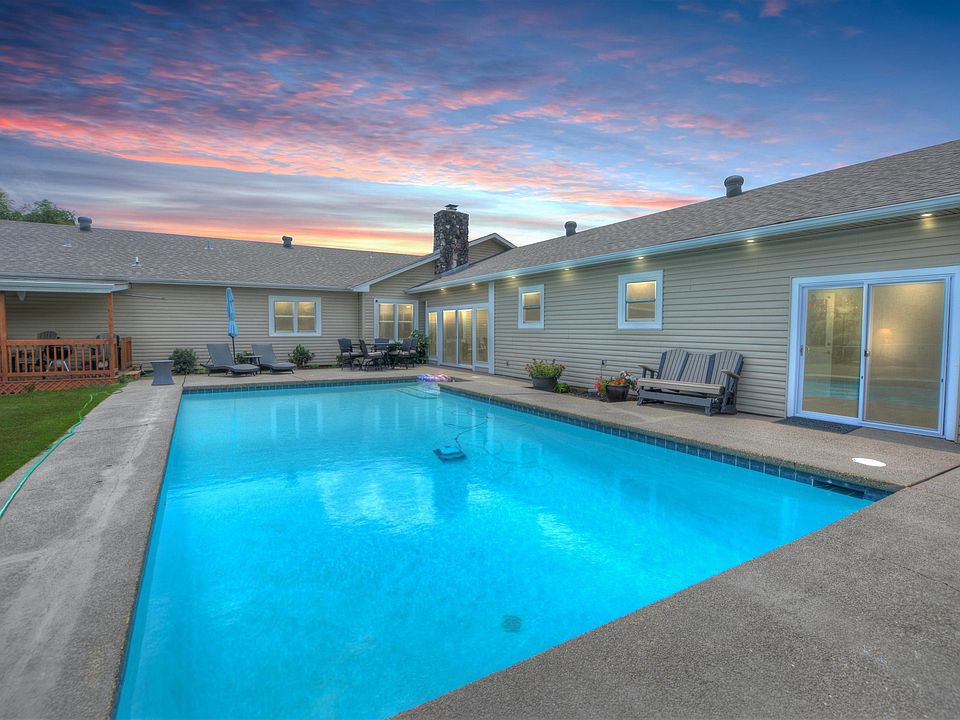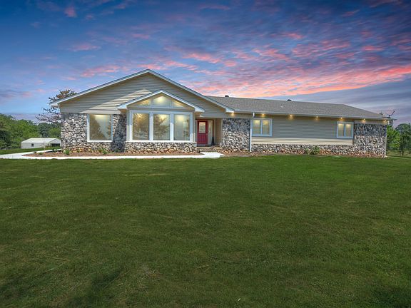 Modern comfort meets country living on 35 beautiful acres with a pond, gently rolling pasture, and multiple barns including a 3-stall horse barn with tack room, hay barn, and storage building. This 4,097 sq ft home was completely updated in 2025 with a redesigned floor plan, new LVP flooring, fresh paint inside and out, fully updated kitchen and primary bath, new lighting, plumbing, windows, and doors. Features include a formal dining room, office, game room, sunroom, and wood-burning fireplace with modern façade. Enjoy a large in-ground pool, expansive patio, and covered deck with fenced play area. New roof in 2023, two-car garage, detached carport, well water with city water available, and septic system.