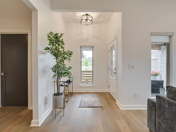 Step into a showstopper home where curb appeal meets captivating design. From the moment you arrive, the cedar-wrapped front porch beckons, leading you into an interior bathed in natural light. Engineered wood floors guide you through an open-concept living space that effortlessly balances entertaining areas with defined, comfortable zones for daily life. This home offers 3 bedrooms and 2 bathrooms, each thoughtfully enhanced with upgrades (see disclosures for a full list!). The primary bedroom suite is strategically positioned at the rear, offering picturesque views of what is likely one of the neighborhood's largest lots. Primary Bathroom suite is equipped with dual vanities + soaking tub + separate shower + walk in closet all finished out with designer details. Additional bedrooms are located at the front of the Home sharing a bathroom that also works great for guests. Each spare bedroom has closet + additional closet for linen/toy storage - so many well thought out details! Last but not least - the backyard! A unique advantage is the additional greenbelt space beyond the fence, beautifully framed by trees & maintained by the HOA, effectively extending your personal greenspace. This vibrant neighborhood caters to an active lifestyle, with an abundance of walking trails, a splash pad, and a playground just moments away. Peace of mind comes with a storm shelter, while practical upgrades like an extended garage, gas range, and custom shades further enhance this exceptional property.