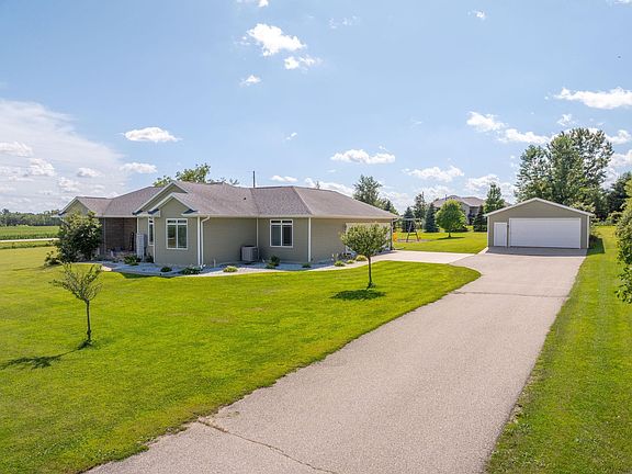 Set on 2.18 acres, this meticulously designed home offers the perfect balance of comfort, functionality, and entertaining space. The open-concept main living area seamlessly blends a bright kitchen and inviting living room beneath vaulted ceilings, highlighted by cherry cabinetry, hardwood floors, and a custom oak entertainment wall. The main-floor primary suite offers a spa-like retreat with dual walk-in closets and a luxurious en-suite bath—complete with a jetted tub, dual sinks, and an oversized tiled shower. Two additional nicely sized bedrooms on the main level share a full bath. There’s also a flexible office or rec room and a convenient laundry area with built-in cabinetry. Downstairs, the finished lower level opens to a sprawling family and entertainment area with a built-in fireplace/media wall and plumbing rough-ins for a future bar. For the ultimate hosting setup, enjoy your very own home theater with stadium seating, red leather couches, three tiers of viewing, 1080p projector, premium sound, and a 110" silver screen—perfect for game days or movie nights. The lower level also includes two additional bedrooms and a shared ¾ bath. Set on 2.18 acres, the outdoor space is just as impressive. Enjoy over 1,600 sq ft of garage space between the attached 3-stall and oversized 2-stall detached garage with roll-up mower door. The backyard is built for entertaining with a firepit area, built-in patio bar, and a deluxe play area with trampoline and oversized playset (negotiable). Additional highlights include discounted all-electric utility service, invisible fence, and high-speed CFU internet. This home offers the perfect mix of thoughtful design, luxurious comfort, and room to grow—inside and out.