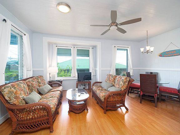 This fully furnished 2-bedroom, 1-bath home boasts a spacious bonus lower level with extra rooms and a full bath, offering flexibility for various uses. The home features high ceilings and wood floors, creating a classic plantation-style ambiance. Electrical has been updated throughout the home to give you peace of mind. Relax on the front lanai and soak in the tropical surroundings of this convenient location. The living room is cozy with lots of windows allowing the trade winds to flow through the home. Both bedrooms are just the right size and fits right in with the vibe of the home. Kitchen has a breakfast nook and features lots of built ins.