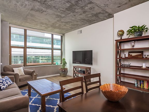 Moody, bold, and delicious, this rare one-bedroom/plus den, one and a half bath Bond property packs a perfect punch. The rich dark walls and cabinetry feel sophisticated, stylish with a bit of romance. The floor plan is functional with open, interactive living areas, and a separate laundry/utility room with drying rack, cabinetry and plenty of room to store your best stuff. Morning sun floods through large, abundant windows. There is a lovely contradiction with exposed cast-in-place concrete, mixed with smooth elegant walls. Du Chateau flooring and artistic lighting add to the sleek design. The kitchen is roomy, featuring a vented gas range, stainless microwave, refrigerator, and dishwasher. Retreat in the large bedroom suite with dual sinks, and a fabulous large walk-in closet with custom closet organizers. Gorgeous faux painting defines the multifunctional den. The separate bath and vanity room conveniently accommodates the space. Central heating and air conditioning are also included. Stylish and swanky, The Bond lobby is the center of activity, with concierge services, homeowners' lounge, and celebrated wine nights.