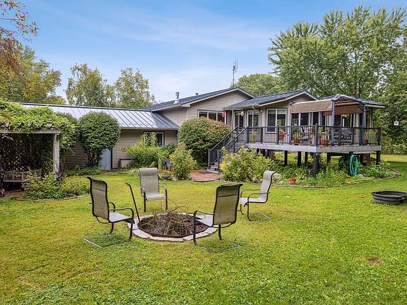 Gorgeous three-level home set on nearly two acres with a peaceful tree-lined backyard. The open concept upper level is designed for both comfort and entertaining, featuring a spacious living area, cozy fireplace, and easy flow into the kitchen and dining spaces. The large upper level bedroom, convenient laundry, and a stunning oversized bathroom add style and function. Relax in the private sunroom or on the maintenance-free deck overlooking the property. With two fireplaces, multiple outbuildings for storage and hobbies, and a durable steel exterior for low-maintenance living, this home offers the perfect blend of charm, practicality, and privacy.