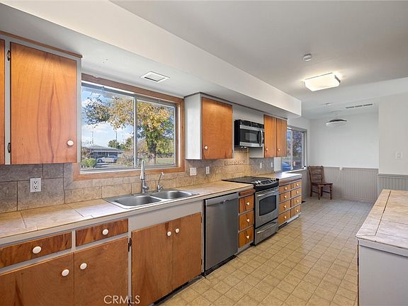 Inside, you’re welcomed by a bright, oversized living room with a classic fireplace, creating a warm and inviting centerpiece for daily living. The home features a large, upgraded galley kitchen with tile countertops, abundant cabinetry, and a full appliance package including range, dishwasher, and microwave. An adjoining dining area easily accommodates a large table—perfect for gatherings and hosting.