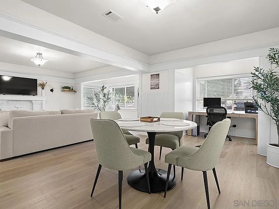 Tucked gracefully behind its storybook façade, this captivating Coronado residence captures the essence of refined coastal living with an inviting blend of warmth, style, and sophistication. Thoughtfully refreshed with a crisp new exterior and curated updates throughout, the home radiates an airy, light-filled ambiance that feels instantly relaxing. The open living area is centered around a classic fireplace and flows seamlessly into the dining and kitchen spaces—perfect for both intimate evenings and casual entertaining. Modern comforts including a new roof, dual-pane windows, upgraded A/C system, and sleek new appliances complement timeless architectural character and a soft, coastal-inspired palette. Upstairs, a versatile bonus room offers space to unwind or create, while the detached studio invites endless possibilities—an inspiring home office, tranquil guest suite, or artful retreat. The expansive 5,825-square-foot lot enhances the sense of privacy and potential, with a detached one-car garage and a backyard ideal for entertaining, gardening, or envisioning a future addition or ADU. Perfectly nestled in the heart of Coronado Village, this home places you just moments from charming cafés, boutique shops, lush parks, and the island’s iconic beaches—where every stroll feels like a seaside escape and life moves at the gentle pace of the ocean breeze.