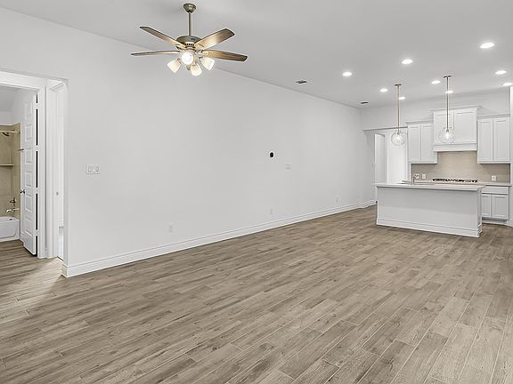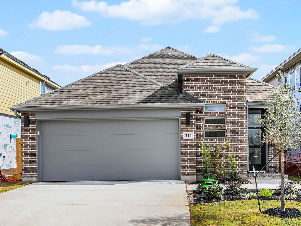 Porch opens to entry with 10-foot ceiling, utility room and mud room. Open family room with three large windows extends to the kitchen and dining area. Island kitchen offers built-in seating space and corner walk-in pantry. Secluded primary suite features large bedroom, dual vanities, glass enclosed shower and a walk-in closet. Secondary bedrooms with walk-in closets, additional bathrooms and two linen closets complete this design. Covered backyard patio. Two-car garage.