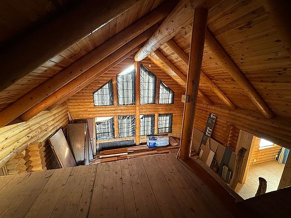 This Beautiful log home while not finished, is primed for its new owners to finish as they see fit . The home is Located near the river and was built for its location with a 4 foot crawl space with sump pump and a French drain around the foundation incase ever needed. There are 4 out buildings, a garden area along with a well.