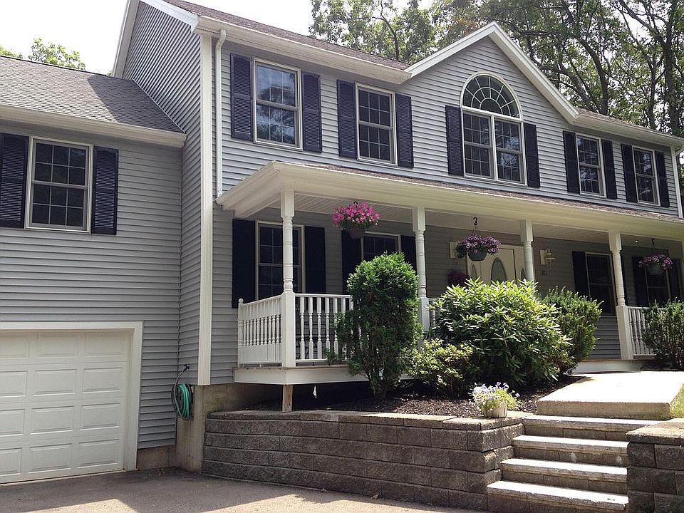 Young four bedroom, 3.5 bath colonial nestled on 1.81 acre lot and abutting acres of land. Charming Farmers porch welcomes you into this home that features an open floor plan and gleaming hardwood floors. Lovely 24 x 24 family room above the garage features cathedral ceiling and gas fireplace. Formal dining and living rooms. Huge eat-in kitchen with maple cabinetry. 1st floor laundry. The second level has four bright bedrooms including the master bedroom with huge walk-in closet and pocket door to the master bath with Jacuzzi tub. Ideal in-law opportunity with the lower level beautifully remodeled, featuring new flooring, a full maple eat-in kitchen, large living room, office with laundry, bathroom with radiant heat, additional room with custom closet and walk-out entrance. Separately zoned heating and central air for main house and lower level. Fully fenced yard with sprinkler system, hot tub and above ground pool.