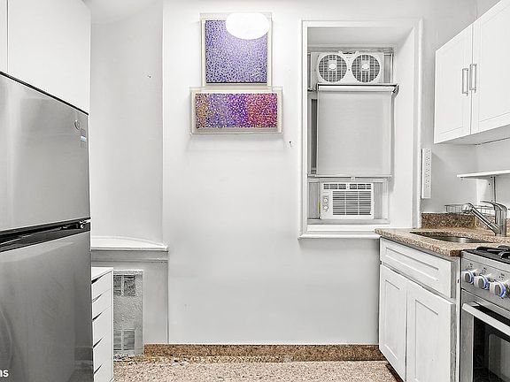 As you enter this versatile home, a gracious and long foyer featuring two large closets for all of your storage needs will welcome you. The bathroom has been tastefully updated with a new vanity and lights, and the windowed kitchen is well appointed with stainless steel appliances and a plethora of custom cabinet storage. The Studio, featuring two large south facing windows, is spacious enough to seamlessly create a natural division of living, sleeping and dining/work from home areas.