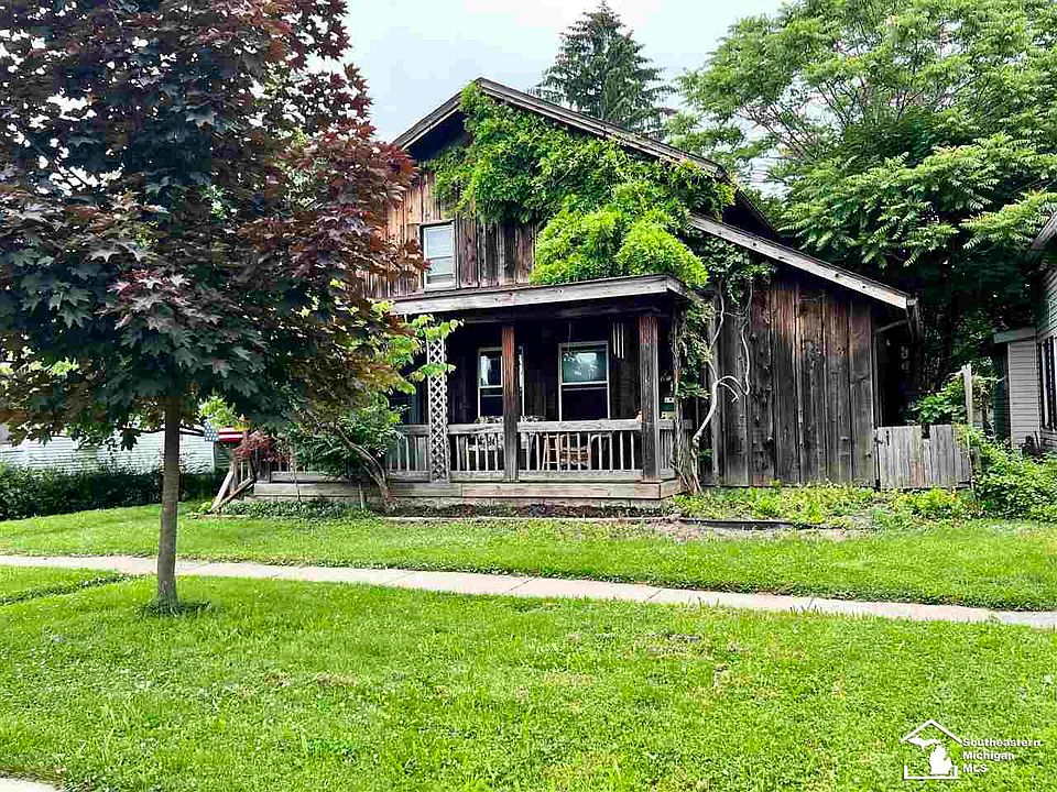 This cedar home built in 1853 (not a typo) will surprise you w it's huge family room addition boasting vaulted ceiling, beams, triple sliding doors to rear yard. Very open plan w modern kitchen, tons of cupboards and long counter for barstools, 2 skylights. Original house has 2 upstairs bedrooms w lighted closets and full bath, downstairs has en suite w large closet area and first floor laundry room. Original house has pine floors. There is a pleasant covered front porch and a huge rear deck. Garage is accessed from alley and 1/2 is a workshop w upstairs for another hobby area, additional paved parking area. Newer furnace. Walking distance to downtown, parks and water. Bring your imagination and make this home your own.
