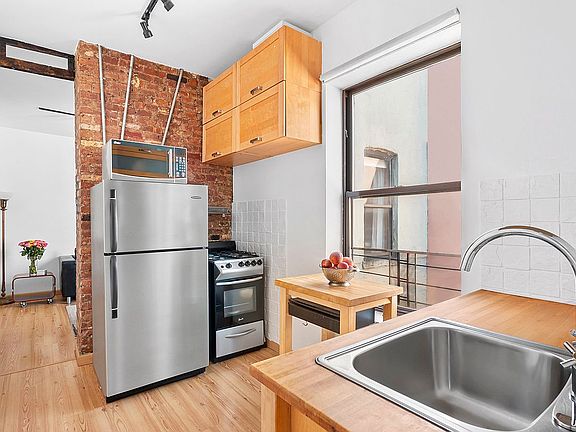 Welcome to this beautifully designed and move-in ready East Village residence, offering a versatile 2-bedroom layout and exceptional value with remarkably low monthly costs of $425. Step into a spacious, sun-filled living area bathed in southern light throughout the day. Just off the living room, a second bedroom with french doors provides the perfect space for guests, a nursery, or a bright home office. The windowed kitchen balances form and function, offering generous counter space and ample cabinetry-ideal for everyday cooking. Retreat to the serene primary bedroom, which features two oversized windows, a large closet, and enough room to accommodate a full furniture suite. The windowed bathroom exudes calm with its neutral palette, warm stone tile, and updated fixtures. Restored exposed brick walls and oak flooring throughout. WASHER DRYER permitted.