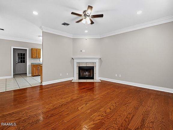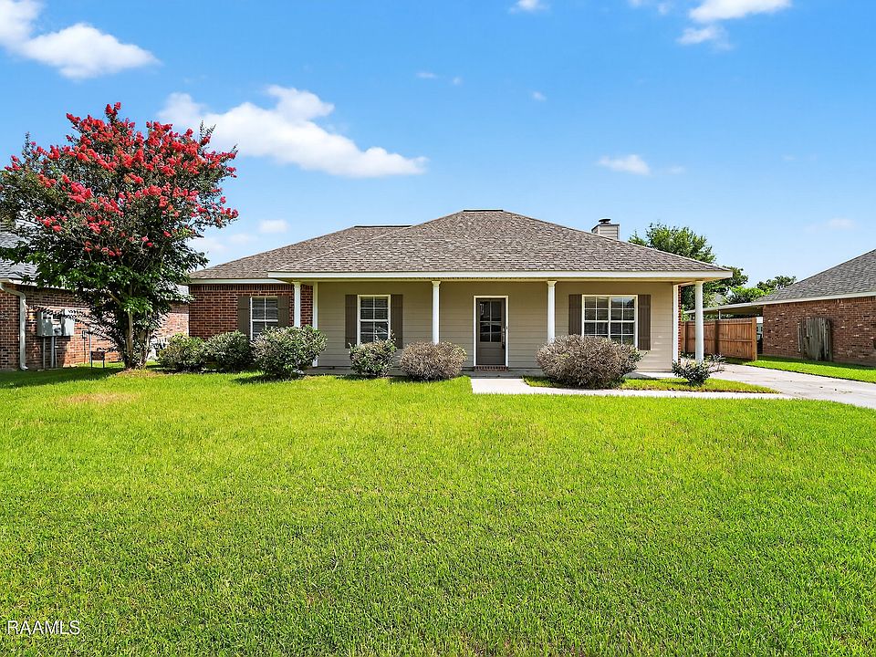 Enjoy peace and tranquility in this adorable home nestled in a serene country setting. Situated on a generous 70 x 131 lot, this property offers a huge backyard perfect for outdoor living and entertaining. Relax on the inviting front porch and take in the quiet surroundings. Inside, you'll find 1,417 square feet of comfortable living space featuring a semi-open floor plan. The cozy den boasts beautiful wood floors and a corner wood-burning fireplace, creating a warm and welcoming atmosphere. The roomy dining area flows into the kitchen, which features light-stained cabinets and ample counter space--perfect for everyday living and gatherings. The master bedroom is a peaceful retreat with wood floors and a soothing ensuite bath that includes a jacuzzi tub, separate shower, double vanities, and a walk-in closet. Two additional bedrooms offer crown molding and plenty of natural light throughout the home, making it feel even more spacious and airy. The garage is tucked away at the rear of the home, offering privacy and curb appeal, with extra parking available along the driveway for guests. With a wonderful layout, priced to move, and all the serenity of country living, this super sweet home is ready for you to move in and make it your own. Come see it for yourself--you'll fall in love!