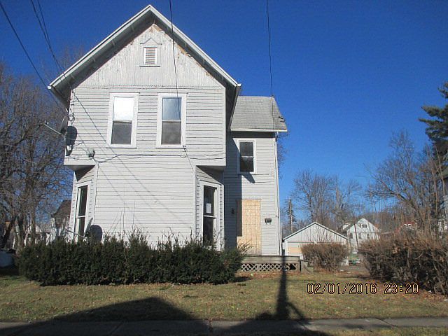 Two family home, apartment interiors are not bad, knotty pine kitchen, new outside stairs to second floor, large 2 car detached garage. Range & refrigerator in upper apartment also in the lower apartment. Separate utilities. Where is AS IS. Mineral & gas rights stay if available.
