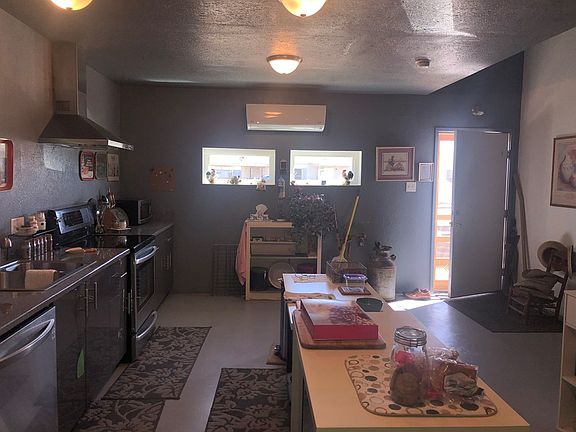 1.986 sf Metal Frame Home built in 2017 featuring a large living area with very high ceilings; an upstairs bedroom with sitting area; large bathroom with tiled walkin shower; large laundry room with storage, open kitchen with stainless steel appliances. This home sits on 3 lots; has a metal exterior for low maintenance; concrete flooring; foam insulation for energy efficiency; 3 mini split units and is all electric.