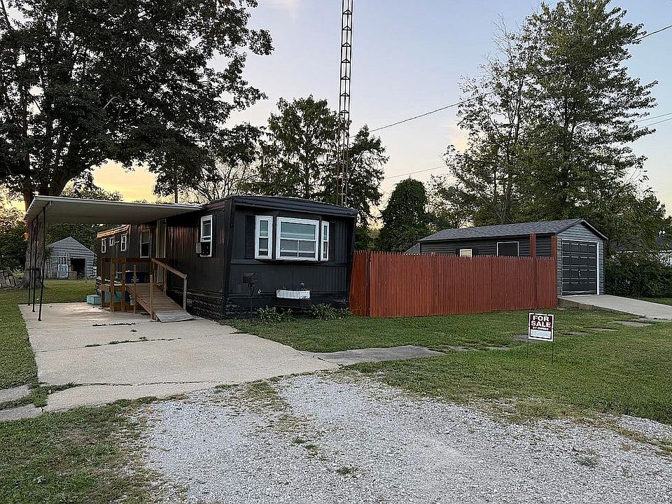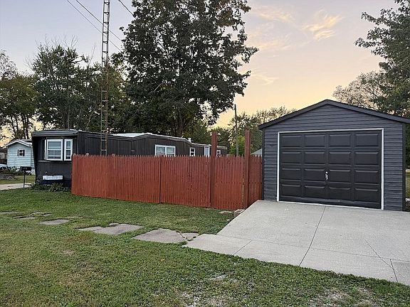 Fully refinished 1971 single wide trailer with attached one car carport on a larger, partially fenced in, lot also includes a 16 x 12 detached garage which is perfect for a little shop or additional storage.