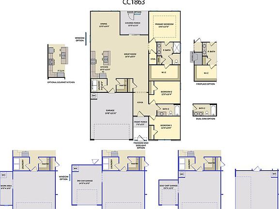 Open kitchen with dining room with views to the backyard and double window option, island with sink overlooking the great room, and pantry; Gourmet kitchen appliance layout option with double wall ovens and cooktopGreat room with optional gas log fireplace and sliding door access to rear covered porch. Optional door layout available.Separate laundry room with optional upper wall cabinets and walk-in pantry at entryway from the garage.Primary suite with tray ceiling option and spacious walk-in closet. Primary bath includes dual sinks, linen closet, private water closet, and walk-in shower.2 additional bedrooms off foyer with access to full hall bathroom with tub/shower combination. Dual sink vanity option available.Front door with optional transom window or sidelight.2 car, 3 car, work area, and golf car garage options; Side load garage option.