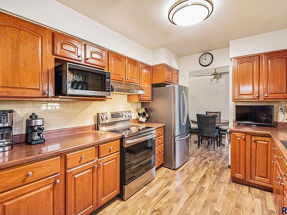 This charming ranch-style home is situated on a spacious lot and features a well-maintained, appealing yard in a highly desirable location! Upon entering, you are warmly welcomed by a spacious 10x23 deck, ideal for sunrise views and an inviting living room. The dining area is comfortably sized and provides access to the deck, while the updated eat-in kitchen is accented with a backsplash and stainless steel appliances. The main level includes three bedrooms, with the primary bedroom providing a convenient half bath. The basement offers a large family room with a cozy fireplace and walk-out access to the patio, along with a non-legal bedroom and ample storage space, including a laundry area. You’ll enjoy the beautiful views from the new spacious multi-level 8x35 deck overlooking a large backyard, which features a sizable shed and mature trees—ideal for outdoor entertaining and relaxation! Additionally, the spacious breezeway provides convenient access to the oversized double attached garage with workspace. Colman is centrally located, offering a short drive to Sioux Falls, Brookings, Madison, and Pipestone, MN.