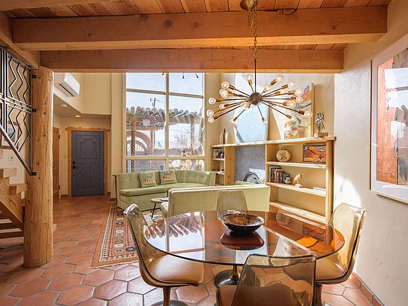Tucked inside the Casa Grande Condominiums, Unit #6 offers a spacious and thoughtfully designed layout that stands out in the Taos condo market. With 3 bedrooms, 2.5 baths, and approximately 1,275 square feet, this multi-level home features a mix of striking architectural details and colorful design elements - including carved kitchen cabinets and southwest-inspired tilework - that give the space personality. The main level includes a dramatic two-story living room with floor-to-ceiling windows on one wall, Saltillo tile flooring in a distinctive hexagonal pattern, a wood-burning fireplace, and decorative trim around a custom black wood front door. Arched doorways guide you through the first floor. The living and dining areas share an open layout while the kitchen connects to the dining space creating an open layout that offers just a bit of separation. The kitchen features a breakfast bar, flattop electric stove, French door refrigerator, built-in microwave, dishwasher, and plenty of storage. Also downstairs: a half bath with a tile countertop and decorative mirror, a coat closet, and a spacious utility room with exterior access, cabinet storage, countertops, and closets - ideal for extra storage or workspace. One bedroom is located on the main level for added flexibility. Upstairs, a lofted second living space with a low wall overlooks the main living area and adds versatility as an office, reading nook, or creative space. Both upstairs bedrooms feature wood floors, wood-beamed ceilings, and ensuite baths. The guest suite includes unique curved walls, a walk-in shower, and Saltillo tile in the bathroom. The primary suite offers large windows, a private balcony with stucco privacy wall, and a tub/shower combo in the bath. At the front entry, an enclosed flagstone patio creates a charming first impression, complete with arched double wooden gates, a high stucco privacy wall, and a latilla cover supported by decorative wood beams. Whether you're looking for room to spread out, architectural character, or a functional floor plan in a central Town of Taos location, this condo checks all the boxes. NOTE: Short term rentals are not allowed. 30 day minimum on rentals.