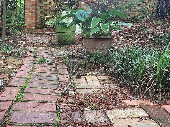 Split-level home. Reclaimed and salvaged lumber and brick were utilized for the home. Over-sized brick, double fireplace. One side is gas, the other is wood. Tongue in grove oak floors reclaimed. Tongue in grove Cathedral, ceilings, throughout. Custom-made tile in the kitchen. Originally built, oak cabinets were antiqued by a local artist. Custom pantry. The the bathroom boasts custom builtin cabinets and shelves of reclaimed, 200-year-old heart pine. Double-paned, argon gas-filled windows. Custom subterranean room with a ground-level door. Designed for artist studio. Lots of windows. Skylights. Hunter Douglas fans throughout. Floor-to-ceiling windows with original transom windows. Five gorgeous, custom, Charleston Style Courtyards. Mature tree and shrubbery. Double-layer brick home. Insulation between the interior and exterior Layers of brick.