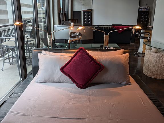 Perfect remote working setup in the heart of downtown Austin. No car needed (though there is a dedicated parking garage spot) as you can walk to everything. Boutique, small condo building with a wall of windows and large 30 foot balcony.