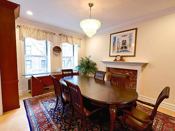 Interiors are marked by spacious rooms and a flowing pre-war layout. Beautiful hardwood floors sit beneath high ceilings with recessed lighting and crown molding. Oversized sash windows enjoy three exposures. Classic details include decorative red marble fireplaces, custom built-ins, and chic pocket doors.