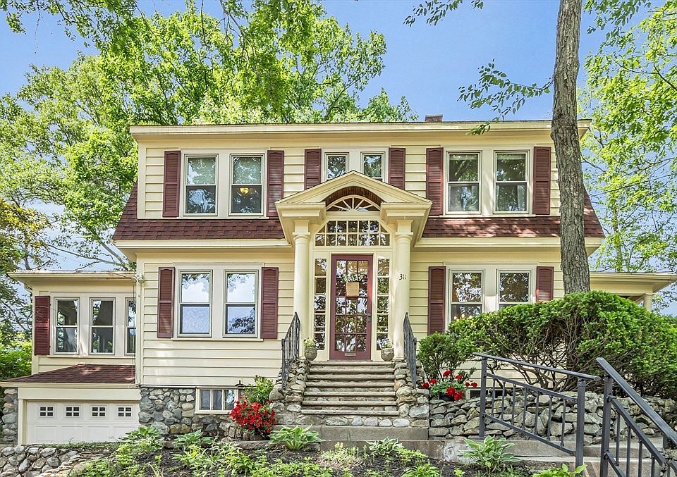 Welcome to your dream home in Melrose's coveted neighborhood near the Fells! This enchanting Dutch Colonial seamlessly blends classic charm with contemporary comfort, while offering a private setting perched aloft on a tree-lined street. Be greeted by gorgeous French doors on either side of the staircase and an inviting alcove with a phone niche. The 2022 kitchen exudes warmth, while a new bath on the first floor and mudroom add convenience. Enjoy a front to back LR with a fireplace, French doors leading into a sunroom, TV room, or office, and a dining room with a built-in cabinet and charming alcove. Four bedrooms, including the primary with custom closets. A walk-up attic offers endless potential. Outside, a tranquil side porch awaits, perfect for morning coffee amidst chirping birds, or enjoy the enchanting backyard. Discover the perfect balance of historic elegance and modern convenience in this Melrose residence. Welcome home to cherished memories and unparalleled comfort!
