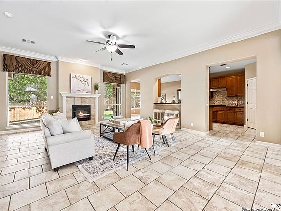 Nestled in the well-established Stonewall Ranch community, this spacious 4-bedroom, 3.5-bathroom home offers a quiet setting at the back of the neighborhood, with no direct neighbors behind the property. The home is designed for both everyday comfort and functional living, with the primary bedroom located on the main level for added privacy and ease. A dedicated office at the front of the home makes working from home simple and convenient. The floor plan includes a welcoming family room filled with natural light, two separate dining areas, and an open loft upstairs that can be used as a game room, study space, or second living area. A striking interior balcony adds architectural interest and overlooks the main living area below. The kitchen and living areas benefit from high ceilings and large windows that bring in light throughout the day. Upstairs bedrooms offer plenty of space, while the overall layout provides flexibility to suit a variety of needs. Step outside to enjoy a greenbelt lot with wooded views and no rear neighbors, offering added peace and privacy. Recent upgrades include a brand-new HVAC system and water heater, both under 10-year warranties, and freshly installed carpet on the stairs. These updates enhance the home's overall comfort and reliability. Residents of this gated community enjoy access to amenities such as swimming pools, playgrounds, and walking paths, all within the highly regarded Northside Independent School District. The location provides quick access to I-10 and is close to shopping, dining, and everyday essentials at HEB, Walmart, the RIM, and La Cantera Shopping Center. Welcome Home!