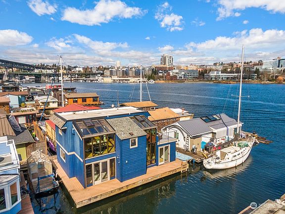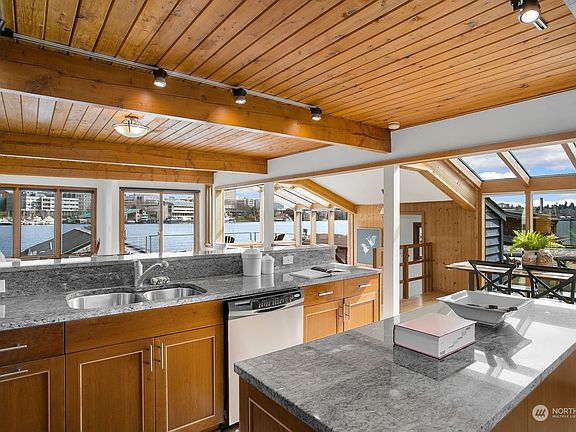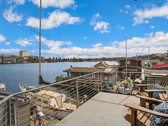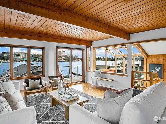 Stunning view Portage Bay floating home! Pride of ownership flourishes with high-end finishes, atrium staircase, and flexible floor plan. Jaw-dropping water views from the great room, a generous open floor plan with deck, chefs kitchen with slab granite counters and stainless appliances. Dine with solarium surround and entertain in style. Tiled entry with vaulted ceilings, walls of windows fill the home with natural light. 2 bedroom/1.25 bath plus ample office & utility room. Large float with wraparound deck, 2 boat moorage slips, secure 1-car parking. Houseboat Harbor coop dock offers additional storage, woodshop, garden, and amazing community spirit with no homeowners dues. Come join us on the lake!