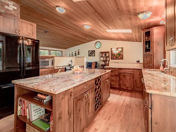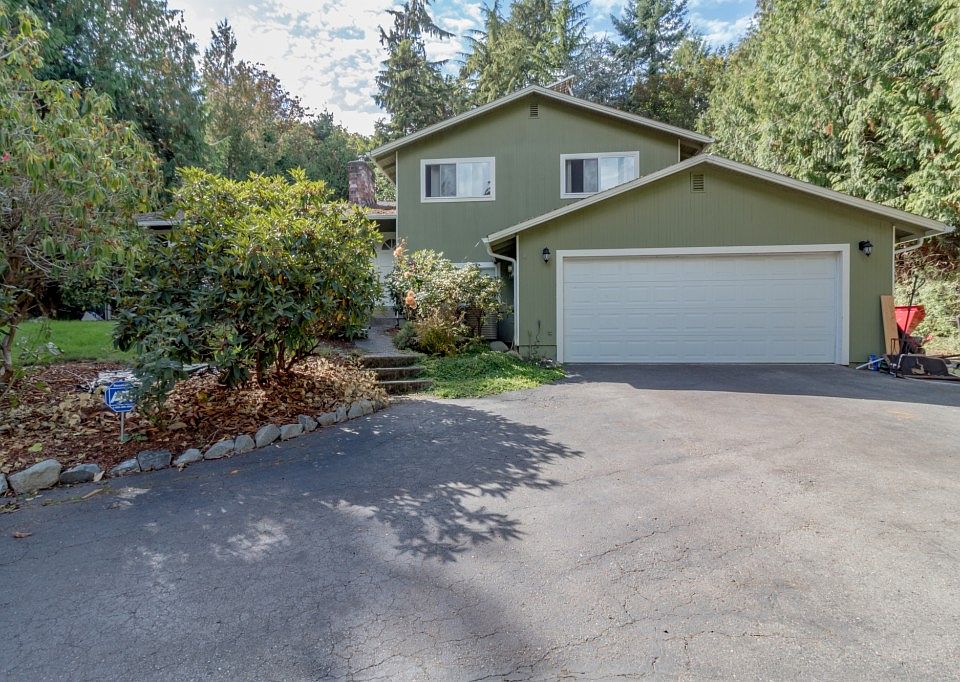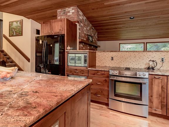 Private retreat located 1/2 block from Dumas Bay trails and beach. This 4+ bedroom, solar powered home, features a full kitchen update w/ oversized custom granite island and counters, soft close cabinets. Main floor has a wood burning stove/fireplace, vaulted ceilings and access to fully fenced yard. New carpet living room /stair case. Lower level has a full bath w/jetted tub. Spacious family room on lower level.Enjoy large covered private deck off master bedroom. RV parking too.