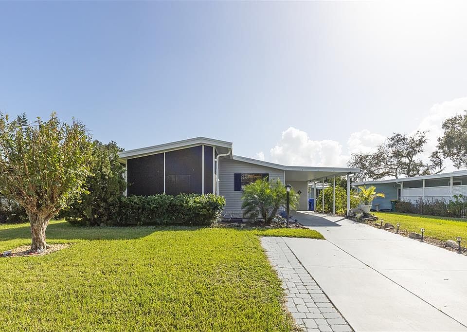 Beautiful 2 bedroom/2bathroom home with a carport and screened-in front porch located in a fantastic, quiet 55+ community with chain of Lake access. NO LOT RENT: You own the land. Beautiful home in a quiet, golf cart friendly, 55+ community. Great layout with vaulted ceilings and multiple upgrades, new flooring, refinished kitchen, new bathroom mirrors and vanities, new interior paint, and more. Stunning and spacious master bedroom with 2 built in closets and an ensuite featuring two vanities, private toilet and stand-in shower. Come enjoy the Waterfront Central Florida Lifestyle. Low HOA of only 60$/month. Newer 2019 Roof and 2017 HVAC. Schedule a showing now!