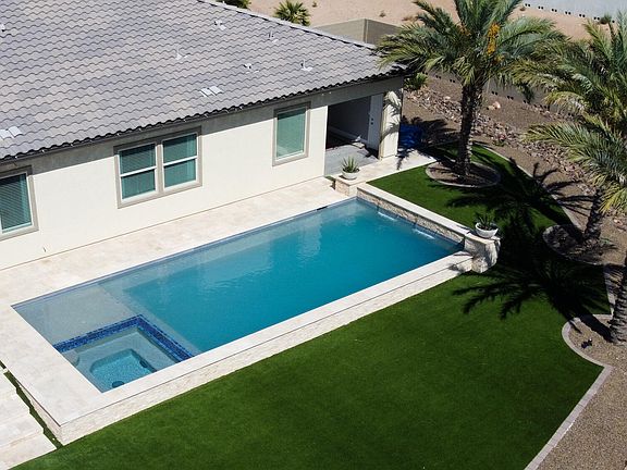 Step outside to your private oasis, where the travertine patio and pool surround invite you to unwind in luxury. The heated pool and hot tub, installed in 2021, are flanked by three towering palm trees, infusing a touch of tropical elegance into the desert landscape. The backyard, enhanced with artificial turf, offers a lush, green space perfect for lounging or entertaining, while the outdoor electric fireplace on the back patio provides the perfect spot to gather with friends and family on cool desert evenings.