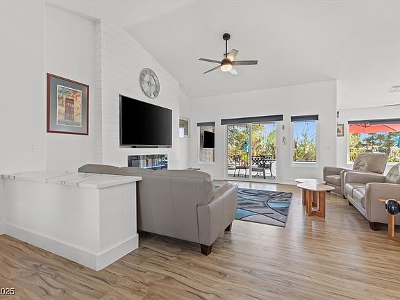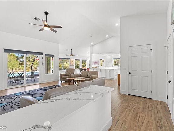 Welcome to this completely remodeled single-story stunner in Sun City Summerlin! Nestled in a quiet cul-de-sac and backing onto a peaceful greenbelt, this 2-bedroom home offers nearly 1,700 sq ft of stylish, low-maintenance living. Inside, you'll find soaring vaulted ceilings, an open floorplan, sleek quartz countertops, and a cozy modern fireplace. Both bathrooms have been beautifully updated, and there's even a dedicated laundry room for added convenience. Step outside to your private resort-style backyard featuring a modern pool and spa, mountain views, and no rear neighbors. Whether you’re entertaining or enjoying a quiet morning coffee, this space delivers. Located in one of the most desirable 55+ communities in Las Vegas, with access to golf, amenities, and social activities galore—this home offers the lifestyle upgrade you’ve been waiting for!