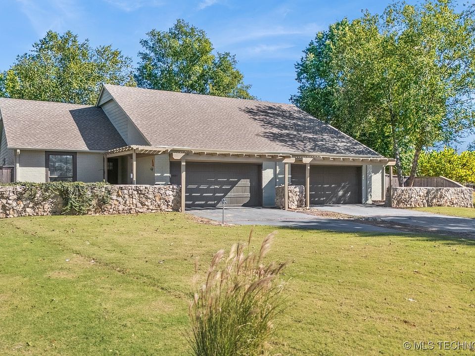 Updated home with flexible space for parents or teens! 2 living areas, 2 Kitchens, and 2 garages! Once a duplex, this home is now a single-family space with 4 bedrooms, 3 baths, and parking for 4 cars. It has new interior paint, exterior siding and paint, carpet, nearly new hardwood floors, and main kitchen. The primary bedroom and closet are large. The primary bath has a separate tub, shower, and toilets with bidets. This home also features zoned heat and air, a whole-home generator, and a storm shelter in the garage. Entertaining space extends to covered patios and a pergola in the backyard. All of this and the home backs to #9 hole at Heritage Hills Golf Course. Come see how this home can be just right for your family!