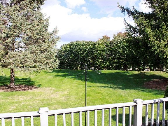 Sliding patio doorLarge composite deckBright open layoutCorian countertopsTile flooringKraftmaid cabinetryBeautifully landscaped green space