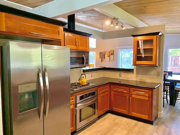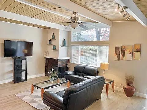 Amazing home boasts an entry atrium drenched in daylight and glass doors on three sides into an open floor plan. It offers a large living room with a modern furniture, luxe electric fireplace, bright oversized windows looking out onto the patio, gorgeous lighting fixtures, and new modern vinyl plank flooring throughout. Spacious dining area & chef's kitchen with beautiful cabinetry, soft close hinges, stainless steel appliances, and a breakfast nook or office area. Please Note: Available ONLY Furnished Dec 15