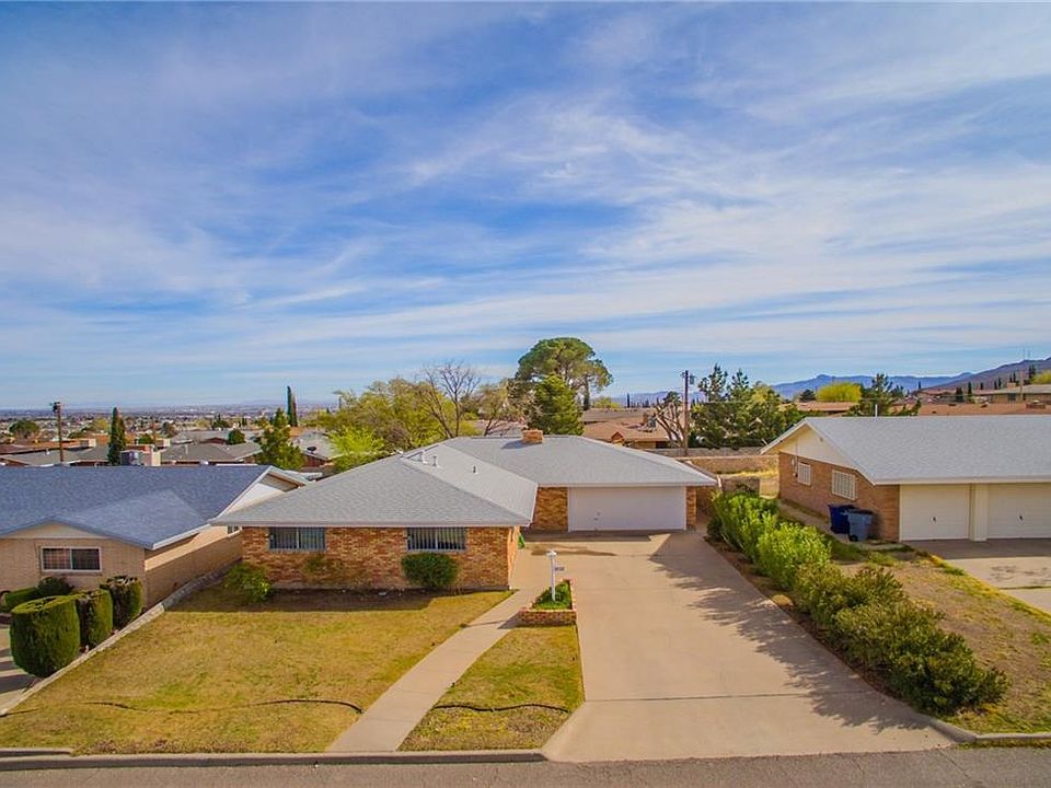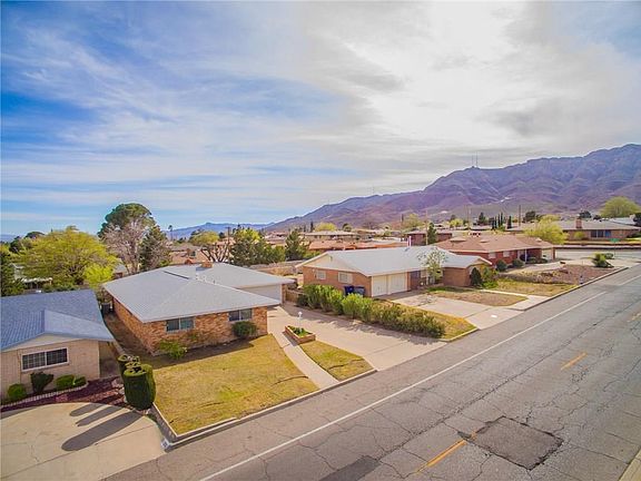 1 story brick home nestled in the peaceful setting of the Franklin Mountains. 4 well-sized bedrooms, 3 with carpet, 3 bathrooms, and original parquet wood flooring. Large dining room with a fireplace, where you can enjoy the views of the mountains. Recently painted Kitchen, including gas stove, refrigerator with breakfast area. An elegant, huge family/living room with access to a covered porch that leads to a private backyard. The backyard includes shade from a large pecan tree, area for gardening and a chili tree on the side of the house. Separate laundry room which leads to 2 car garage. This well maintain home with refrigerated air is walking distance to schools, a park, and near to William Beaumont Army Medical Center, & Fort Bliss.
