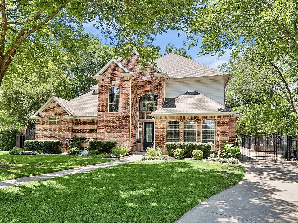 Gorgeous COLLEYVILLE home located on quiet secluded cul-de-sac with wrought iron gated driveway - Over quarter acre lot with mature trees in front & backyards - May 2024 New Carpet & many rooms freshly painted - Huge game room upstairs with 3 large bedrooms with nice closets - Open floor plan with vaulted ceilings on 1st floor & double sided fireplace - Huge picture windows overlook the outdoor covered patio & built in grill leading to stone firepit all shaded by canopy of shade trees - Highly sought after Grapevine Colleyville School District - 500 feet walking distance leads to Colleyville Nature Center - 46 acres of natural refuge, 9 ponds, 3.5 miles of multi-use trails, amphitheater, covered pavilion with a grill, restrooms, drinking fountain, rest benches, playground and fishing pier - Extra storage provided with outdoor shed, upstairs walk in attic space & walk in closet space under stairway which provides interior shelter during storms - New appliances 2020 - New AC '18 & '21.