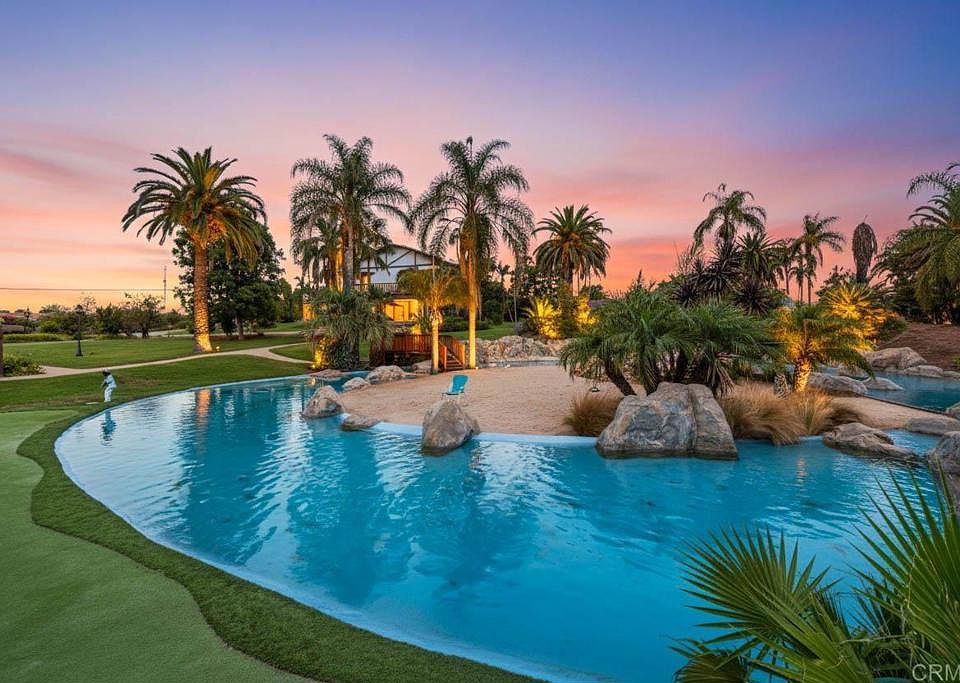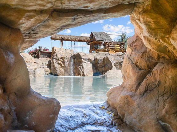 Paradise is a lifestyle in this stunning estate, offering luxury living inside and out. Outdoors, enjoy your own private resort featuring an adult pool, wading pool, lazy river wrapped around a beach island, sand, 11 waterfalls, two fire pits, a mini-golf area, playground, outdoor kitchen, horseshoe pits, and a brand-new deck. Take the elevator to a 1,000 sq. ft. great room designed for ultimate entertaining with its own kitchen, fireplace, dining area, bathroom, and breathtaking views perfect for gatherings, events, or relaxing in style. This gated property includes two garages with immense storage, RV parking with hookups, four driveways, fully paid solar, and brand-new AC. Inside, you’ll find formal living and dining areas, multiple fireplaces, spacious bedrooms, and flexible spaces that combine elegance with functionality. A true one-of-a-kind estate perfect as a forever home or private venue where lifestyle and paradise come together.