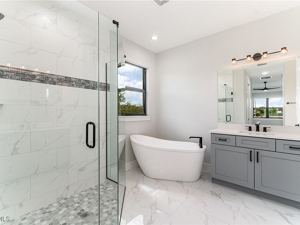 Screened-in lanaiElegant quartz countertopsVersatile denElegant tray ceilingLawn irrigationStandalone soaking tubStunning large tile flooring